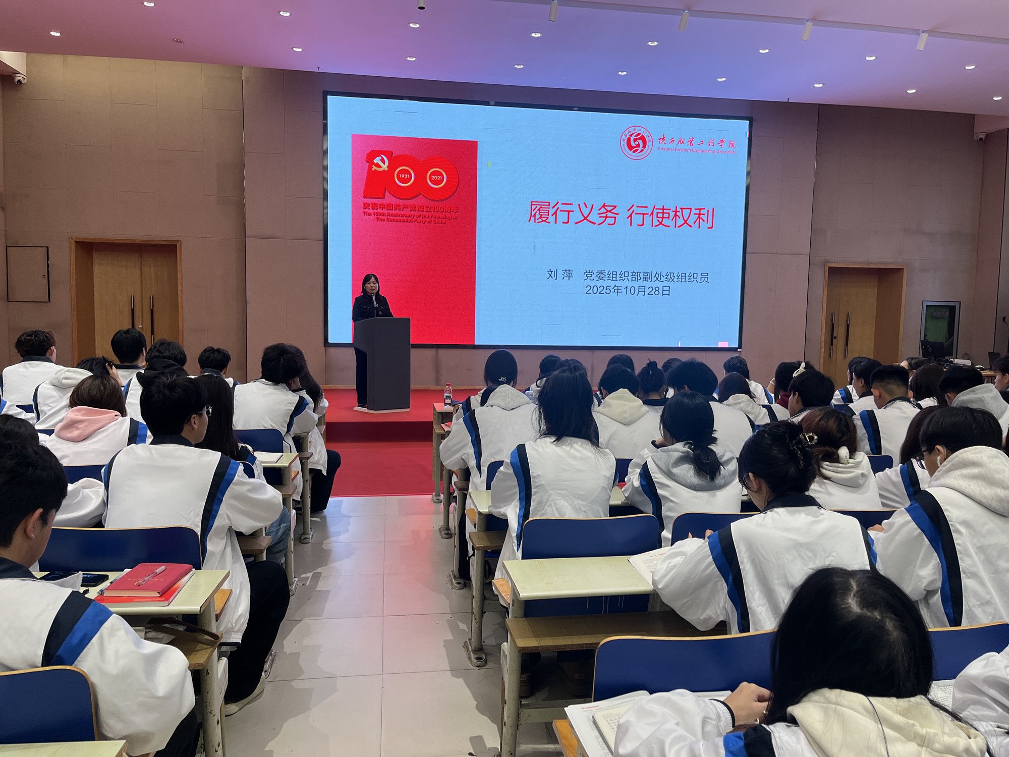 党委组织部部长伍建成作了党的二十届四中全会精神宣讲,重点讲解了党的二十届四中全会会议概况、重大意义、关于教育科技人才方面的精神,以及学习贯彻会议精神的要求。并以“熟悉入党程序,争取早日入党”为题,全面讲解了入党流程及注意事项。勉励同学们要掌握扎实的科学文化知识,全面提高自己的综合素质,做到德智体美劳全面发展;要时刻以党员的标准来要求自己,积极主动为学校和广大师生服务;要始终保持思想上和行动上的先进性,既要密切联系同学,关心同学,又要有强烈的责任感和奉献精神。