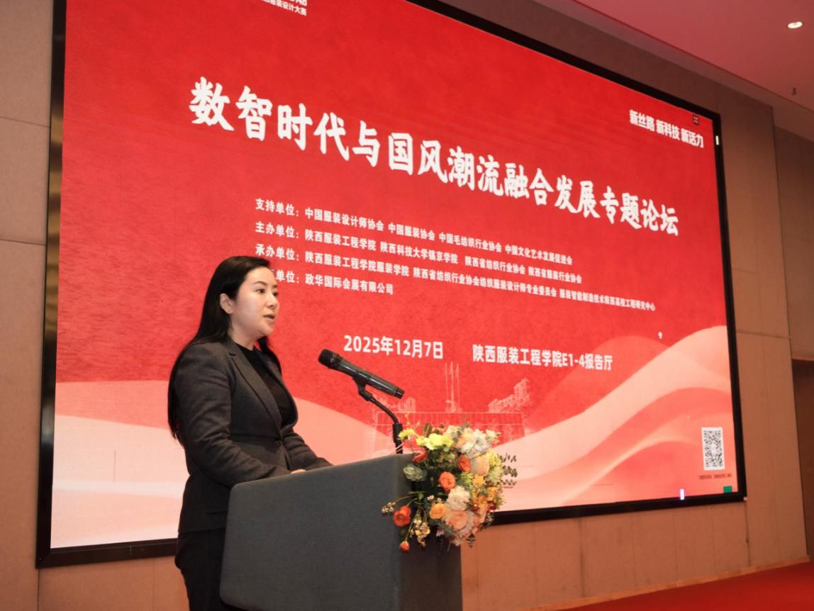 我校副校长潘庆才致开幕辞,代表学校对各位领导、嘉宾的到来表示热烈欢迎,对长期以来关心支持陕西服装产业及高校服装教育发展的各界人士表示衷心感谢。他表示,我校服装学院拥有省级一流专业集群,与长三角及珠三角龙头企业共建实践基地,不断深化校企协同,为行业输送大批复合型人才。长期以来,以AI赋能服装服饰设计、服装3D数字建模为教学特色,始终立足陕西地域文化与非遗资源,深耕服装服饰设计人才培养,此次论坛搭建了产学研用深度融合的优质平台,必将推动数智技术与国风潮流在服装领域的创新实践,助力陕西乃至全国服装产业转型升级。