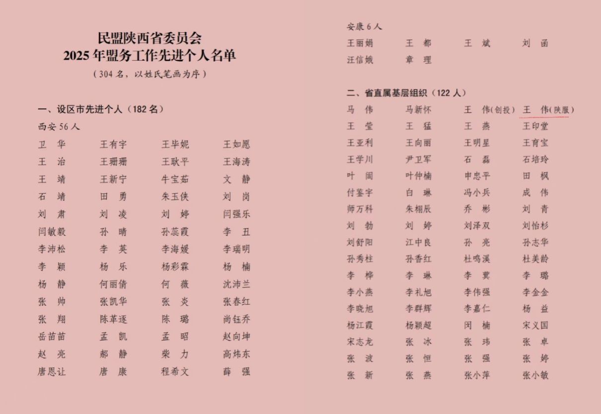陕服新闻网讯(党委统战部)1月17日至18日召开的民盟陕西省第十三届委员会第四次全体会议对2025年在盟务工作中取得突出成绩的集体和个人进行了表彰,我校民盟支部获民盟陕西省委2025年“省直属先进基层组织”称号,支部主委王伟被民盟陕西省委评为2025年“盟务工作先进个人”。
