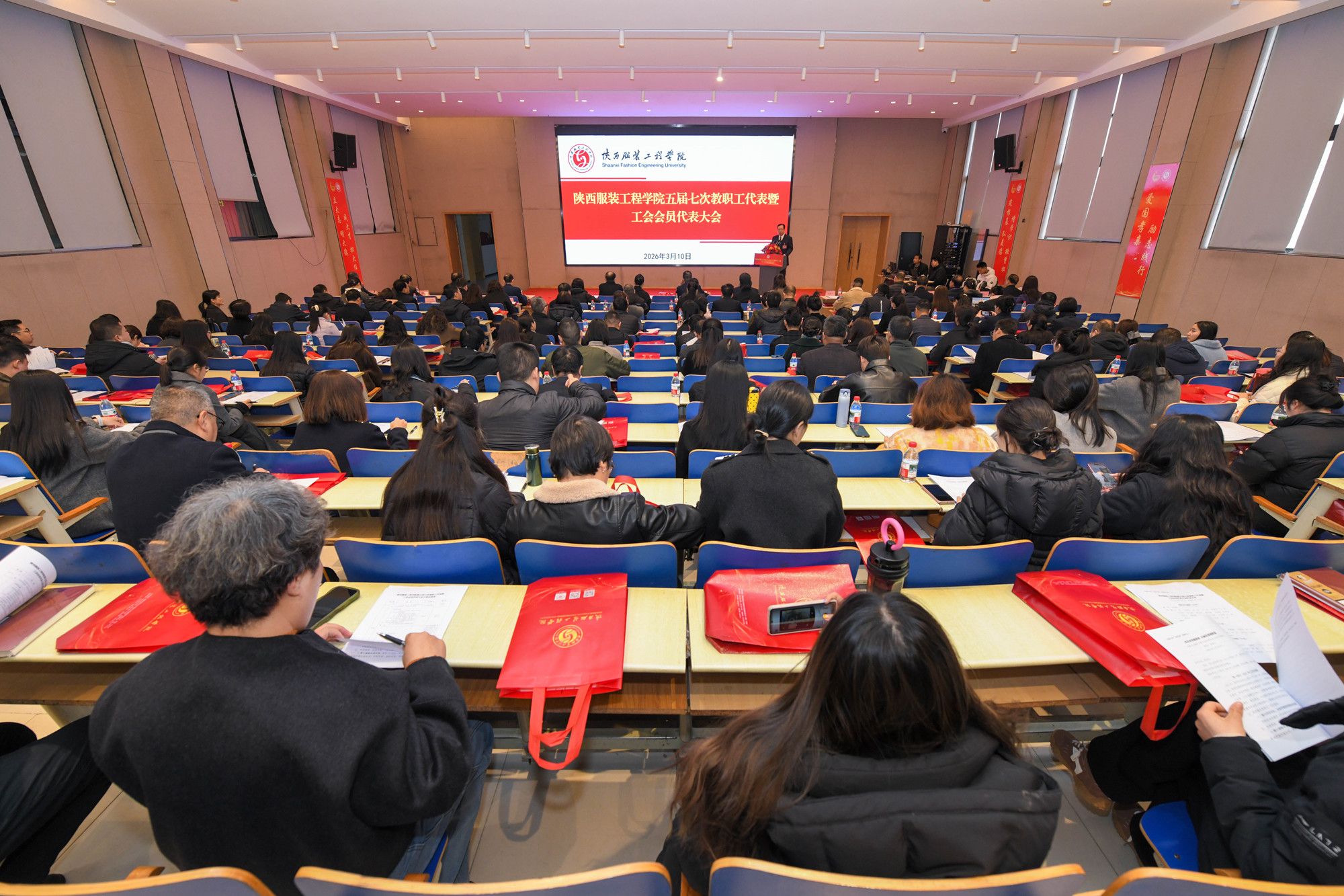 陕服新闻网讯(李文斌)3月10日,我校第五届第七次教职工代表大会暨工会会员代表大会(以下简称“双代会”)在E1-4报告厅召开。大会以“改革攻坚提质效,内涵发展谱新篇,为建设特色鲜明的一流应用型大学而努力奋斗”为主题,审议通过了校长工作报告、工会工作报告及提案征集处理情况报告,并原则通过了《陕西服装工程学院“十五五”发展规划(草案)》及《陕西服装工程学院自有专任教师第一轮聘期考核和第二轮岗位聘任实施办法》。大会127名正式代表、26名特邀代表齐聚一堂,共商学校发展大计。代表们围绕学校改革发展积极建言献策,提出了诸多富有建设性的意见建议,充分彰显了民主团结、求真务实的大会精神。