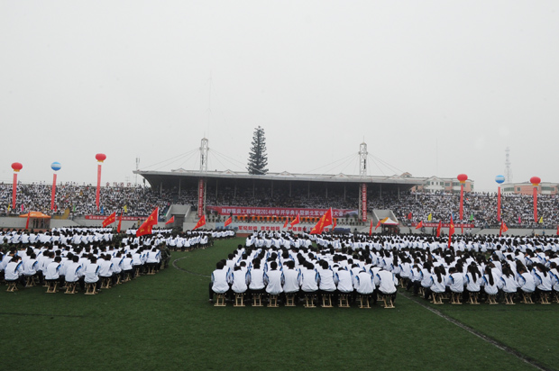 雨后的田径场绿草如茵,彩旗飘扬,几十盆鲜花鲜艳夺目,10个鲜艳的气球载着标语腾空而起。经历了十多天军训的2014级新生排列成30个方队,队列整齐,歌声嘹亮,展示了他们青春的活力和勃勃英姿。近6000名往届学生坐满了看台,共迎新的学年。